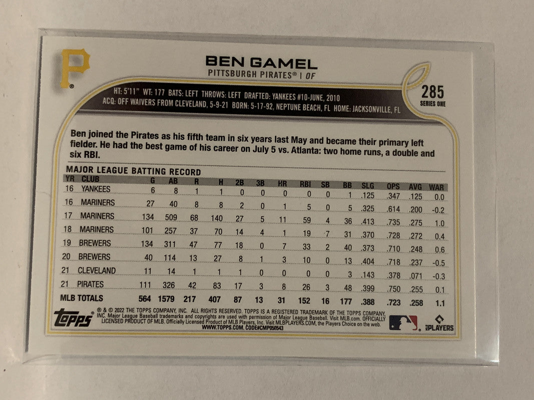 #285 Ben Gamel Pittsburgh Pirates 2022 Topps Series 1 Baseball Card MLB