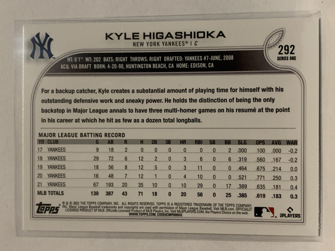 #292 Kyle Higashioka New York Yankees 2022 Topps Series 1 Baseball Card MLB