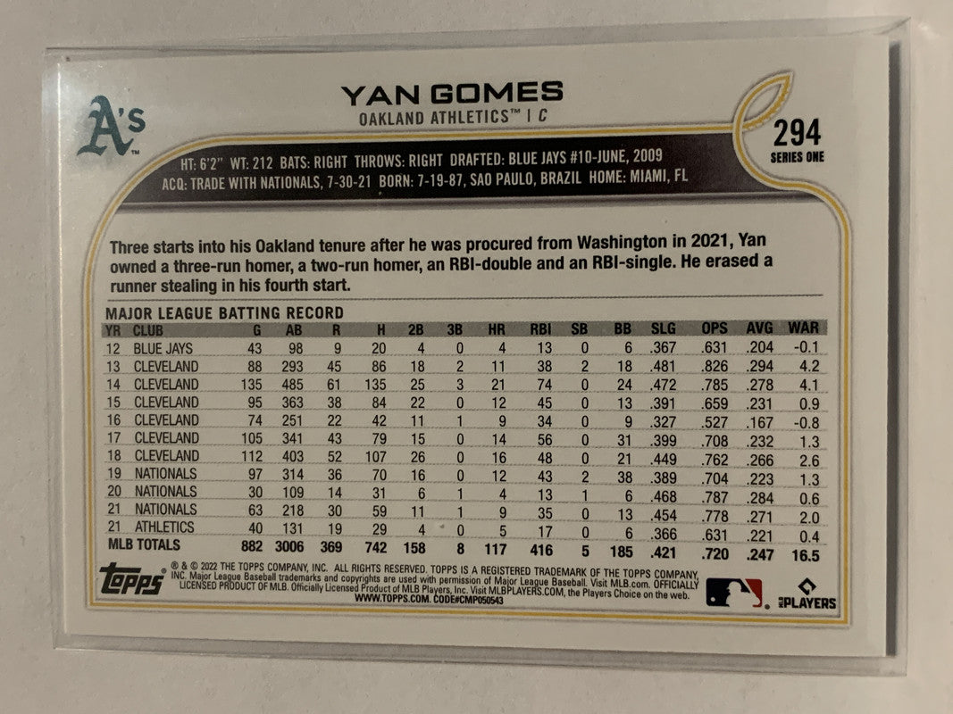 #294 Yan Gomes Oakland Athletics 2022 Topps Series 1 Baseball Card MLB
