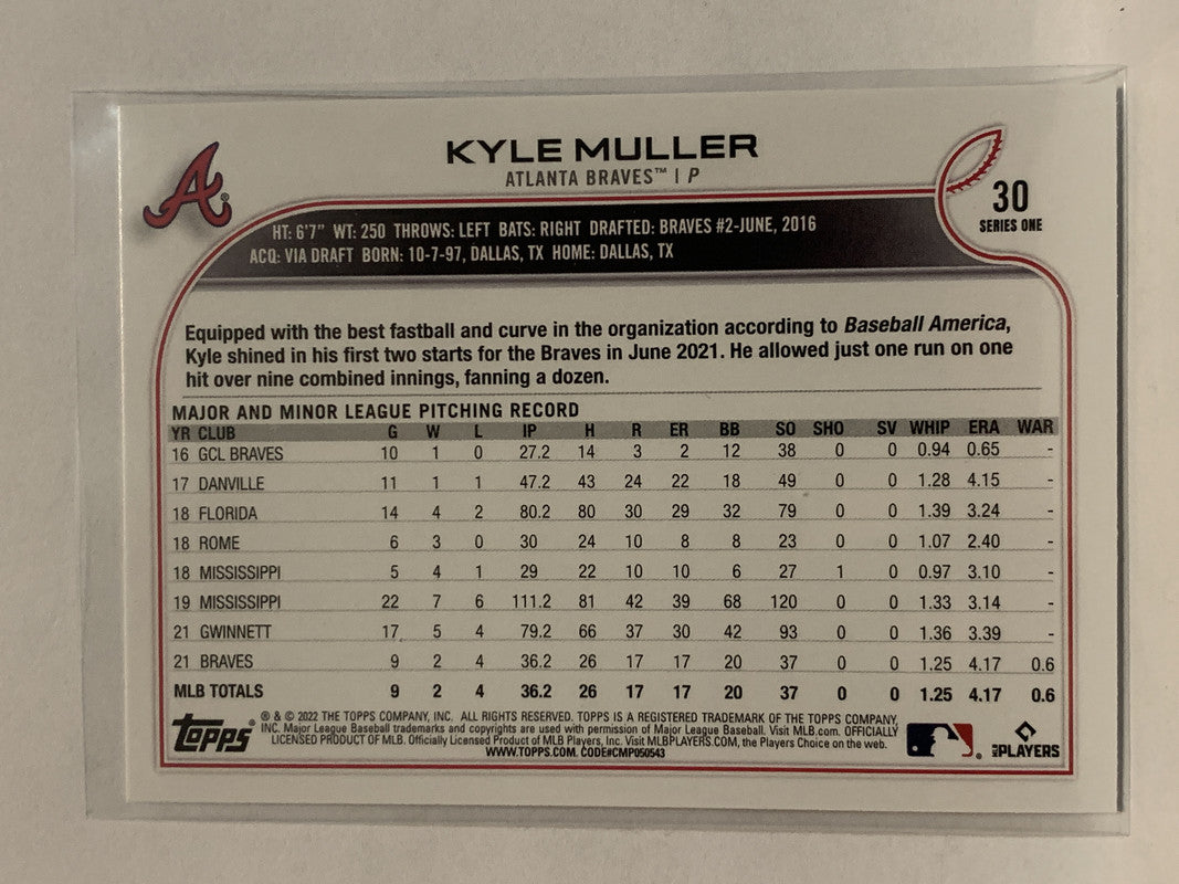 #30 Kyle Muller Rookie Atlanta Braves 2022 Topps Series 1 Baseball Card MLB