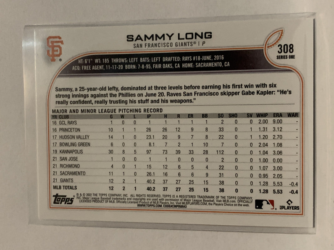 #308 Sammy Long Rookie San francisco Giants 2022 Topps Series 1 Baseball Card MLB