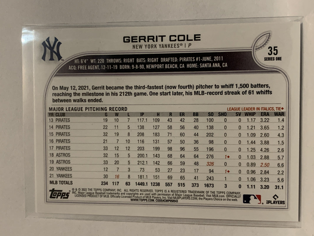 #35 Gerrit Cole New York Yankees 2022 Topps Series 1 Baseball Card MLB
