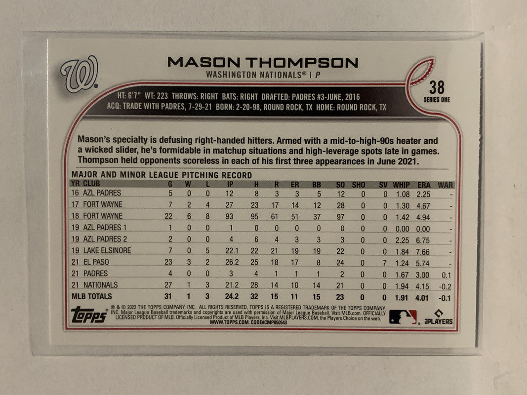 #38 Mason Thompson Rookie Washington Nationals 2022 Topps Series 1 Baseball Card MLB
