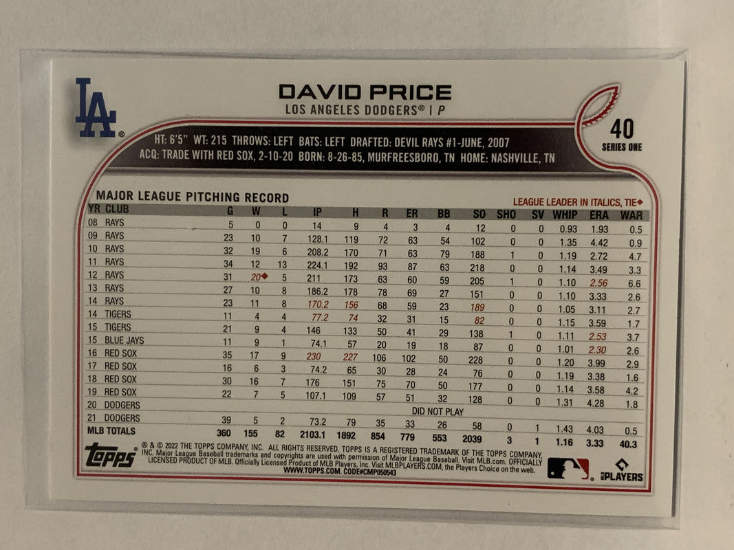 #40 David Price Los Angeles Dodgers 2022 Topps Series 1 Baseball Card MLB
