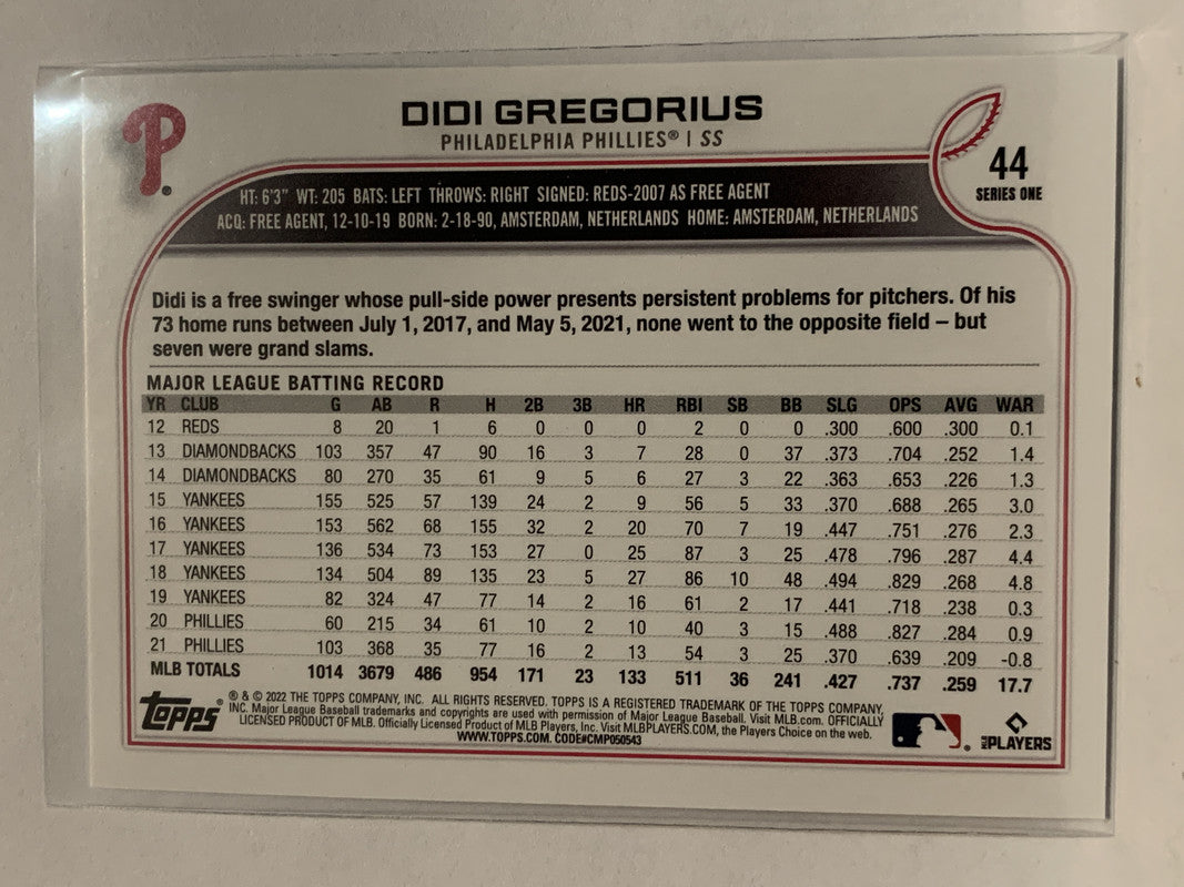 #44 Didi Gregorius Philadelphia Phillies 2022 Topps Series 1 Baseball Card MLB