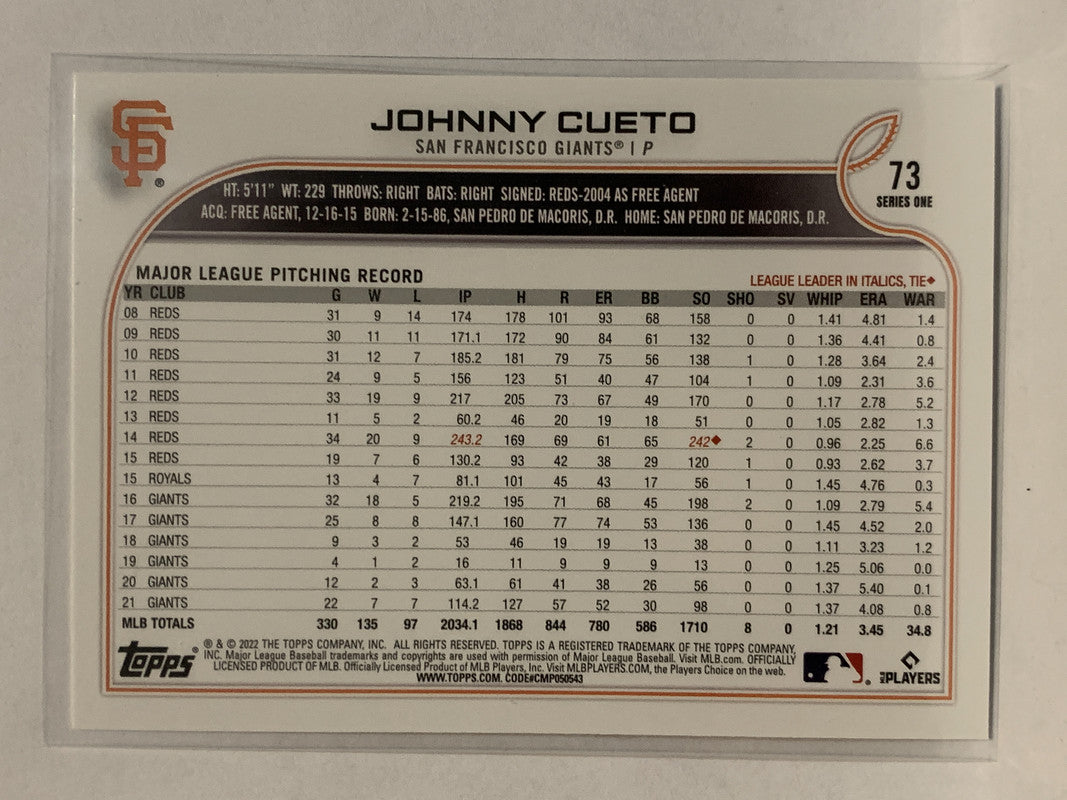 #73 Johnny Cueto San Francisco Giants 2022 Topps Series 1 Baseball Card MLB