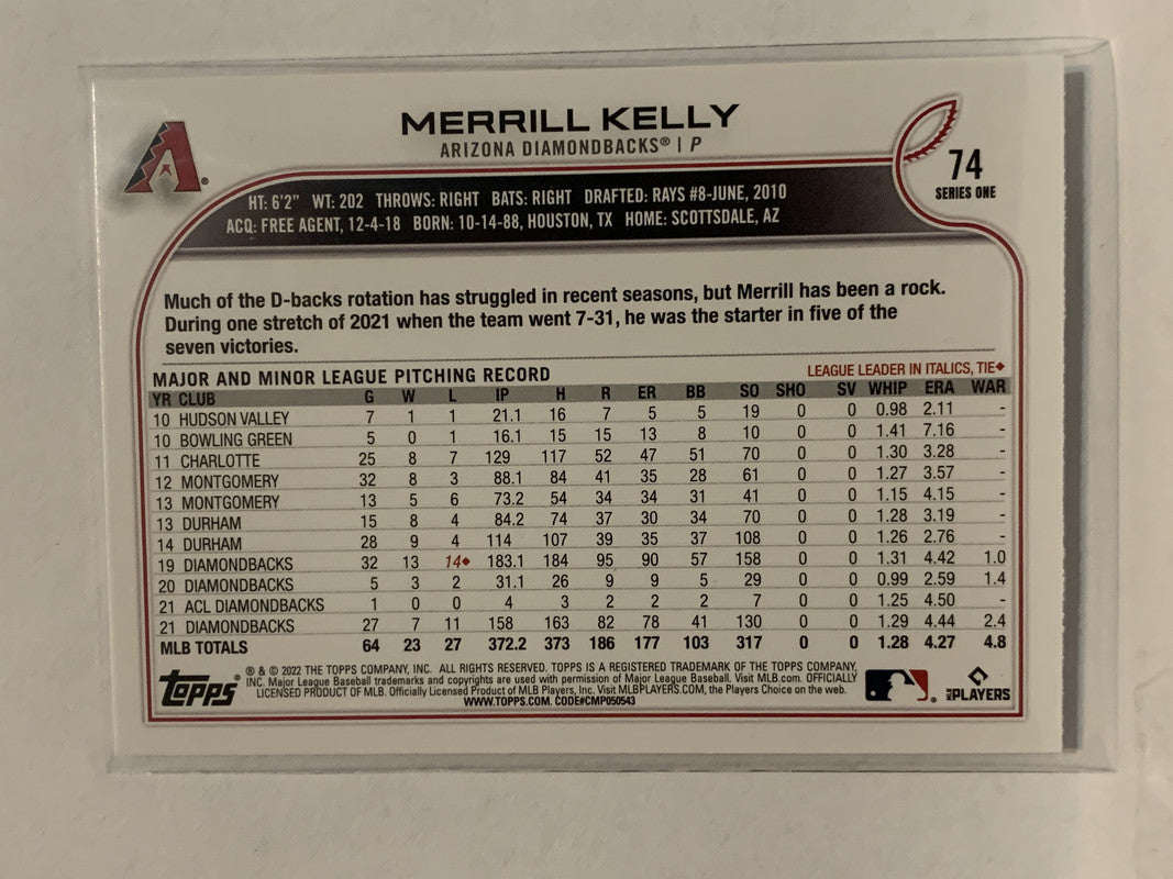#74 Merrill Kelly Arizona Diamondbacks 2022 Topps Series 1 Baseball Card MLB