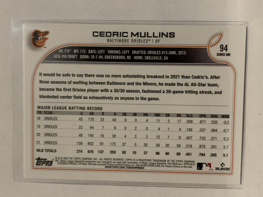 #94 Cedric Mullins Baltimore Orioles 2022 Topps Series 1 Baseball Card MLB
