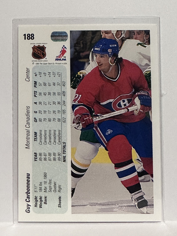 #188 Guy Carbonneau Montreal Canadiens 90-91 Upper Deck Hockey Card