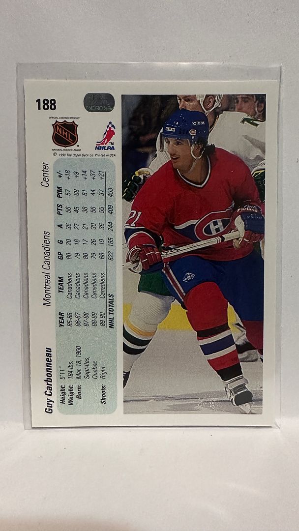 #188 Guy Carbonneau Montreal Canadiens 90-91 Upper Deck Hockey Card