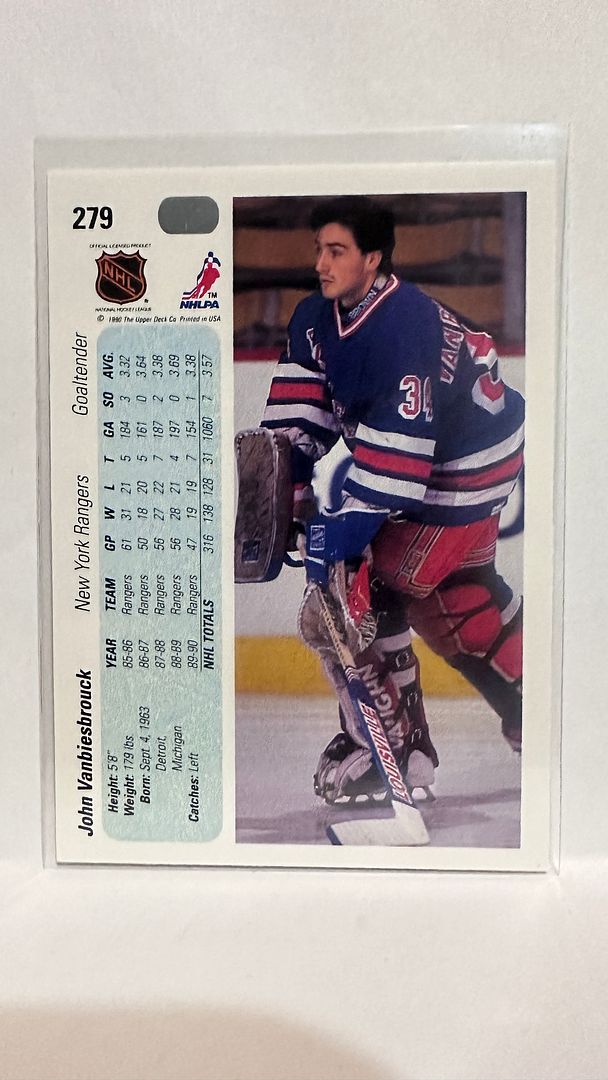 #279 John Vanbiesbrouck New York Rangers 90-91 Upper Deck Hockey Card