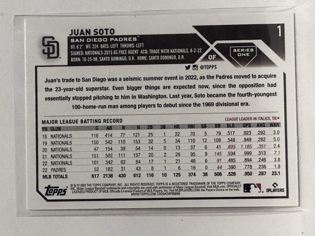 #1 Juan Soto San Diego Padres 2023 Topps Series One Baseball Card