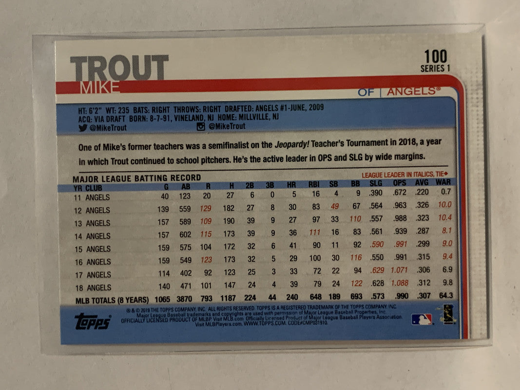 #100 Mike Trout Los Angeles Angels 2019 Topps Series One Baseball Card