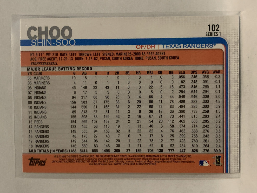 #102 Shin-Soo Choo Texas Rangers 2019 Topps Series One Baseball Card
