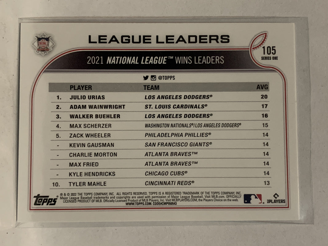 # 105 Urias Wainwright Beuhler Wins Leader 2022 Topps Series 1 Baseball Card