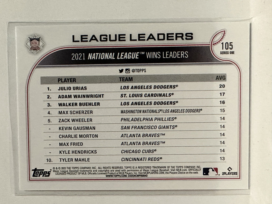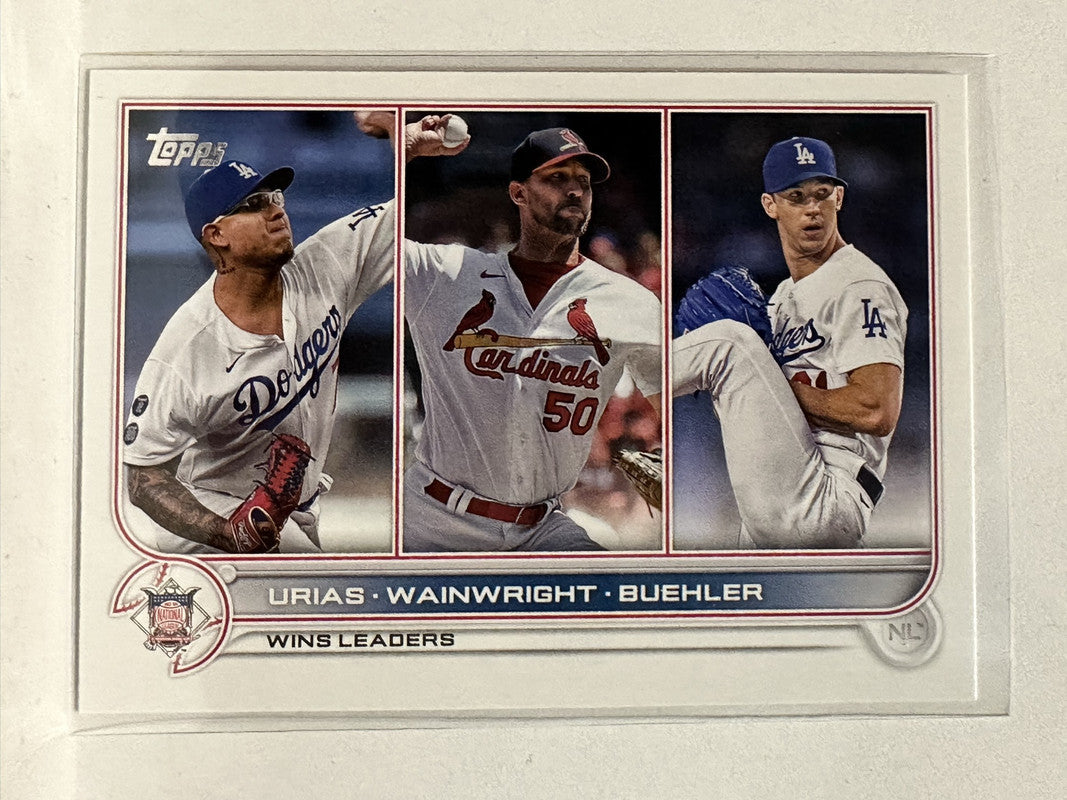 #105 Urias Wainwright Buehler Wins Leader 2022 Topps Series One Baseball Card