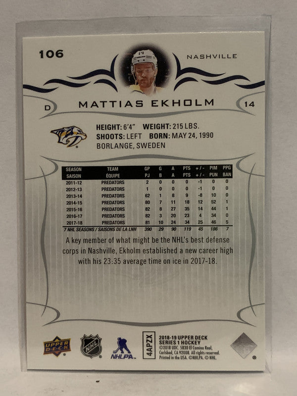 #106 Mattias Ekholm Nashville Predators 2018-19 Upper Deck Series One Baseball Card