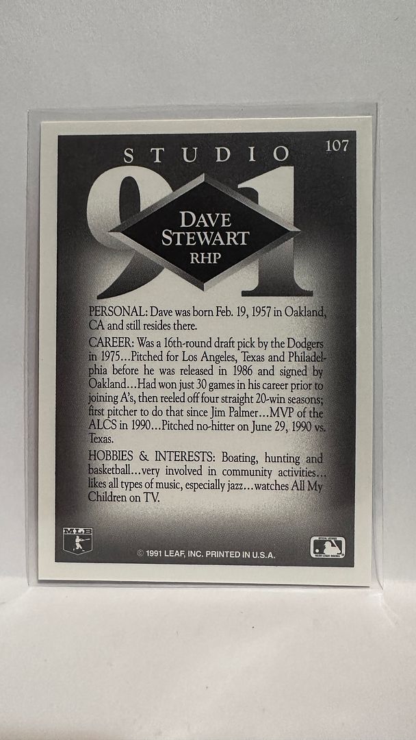#107 Dave Stewart Oakland Athletics 1991 Studio Baseball Card