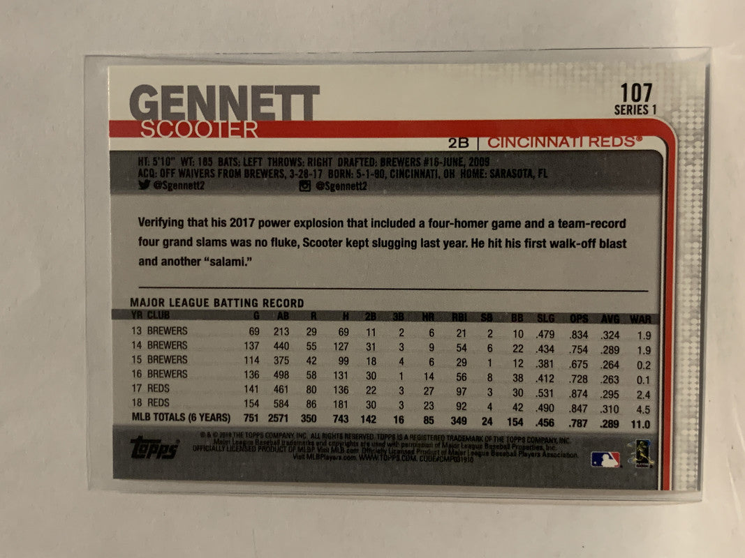 #107 Scooter Gennett Cincinnati Reds 2019 Topps Series One Baseball Card