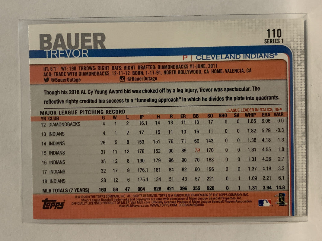 #110 Trevor Bauer Cleveland Indians 2019 Topps Series One Baseball Card