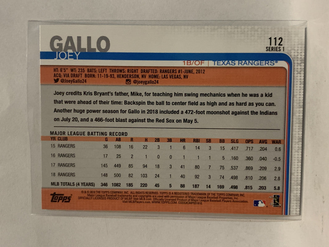 #112 Joey Gallo Texas Rangers 2019 Topps Series One Baseball Card
