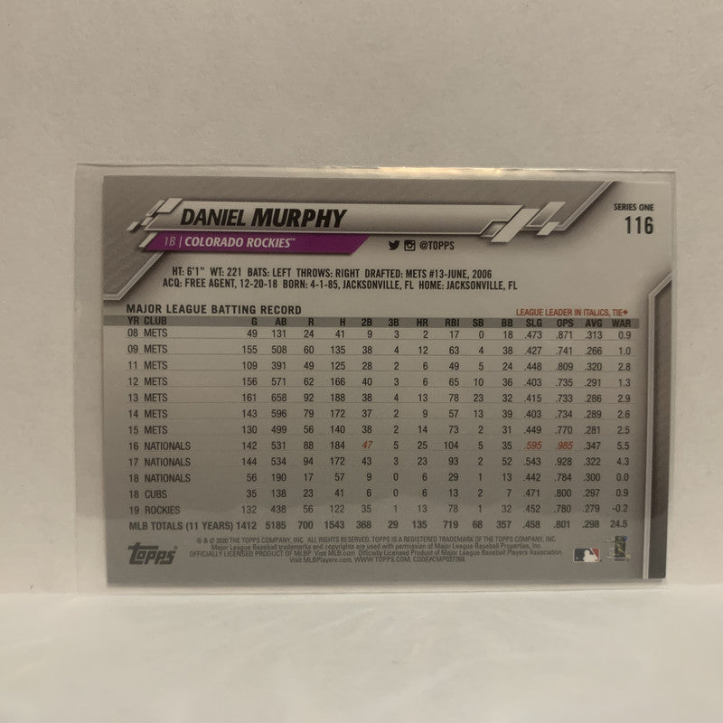 #116 Daniel Murphy Colorado Rockies 2020 Topps Series One Baseball Card JB