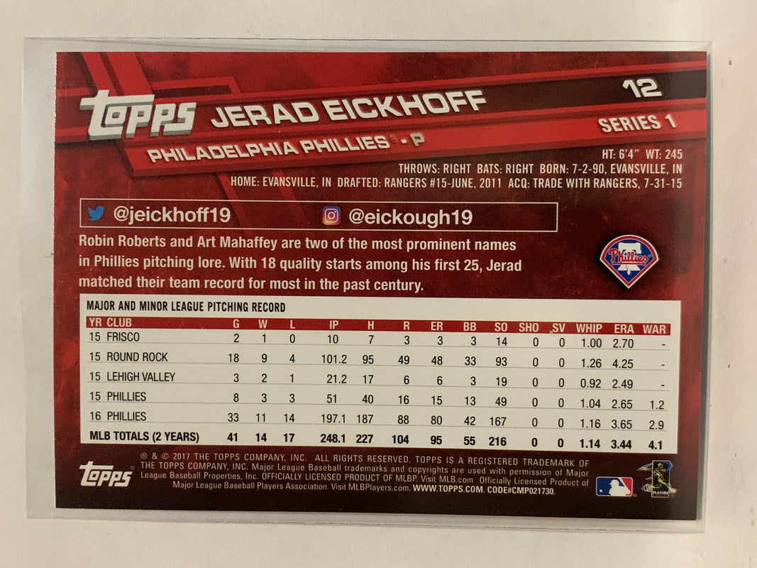 #12 Jerad Eickhoff Philadelphia Phillies 2017 Topps Series One Baseball Card