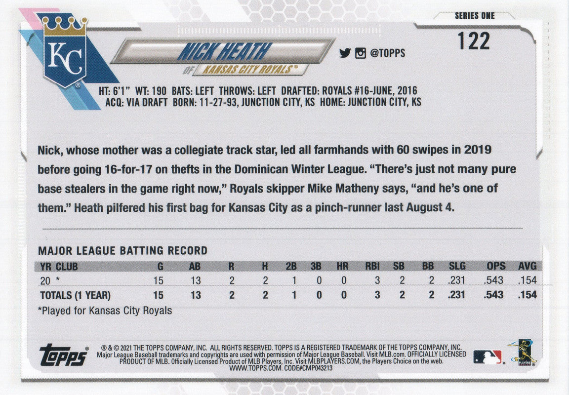 #122 Nick Heath Rookie Kansas City Royals 2021 Topps Series 1 Baseball Card