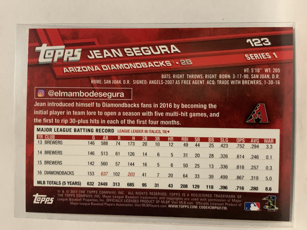 #123 Jean Segura Arizona Diamondbacks 2017 Topps Series One Baseball Card
