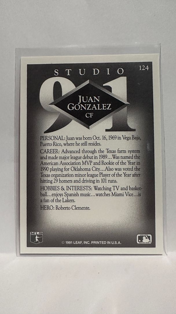 #124 Juan Gonzalez Texas Rangers 1991 Studio Baseball Card