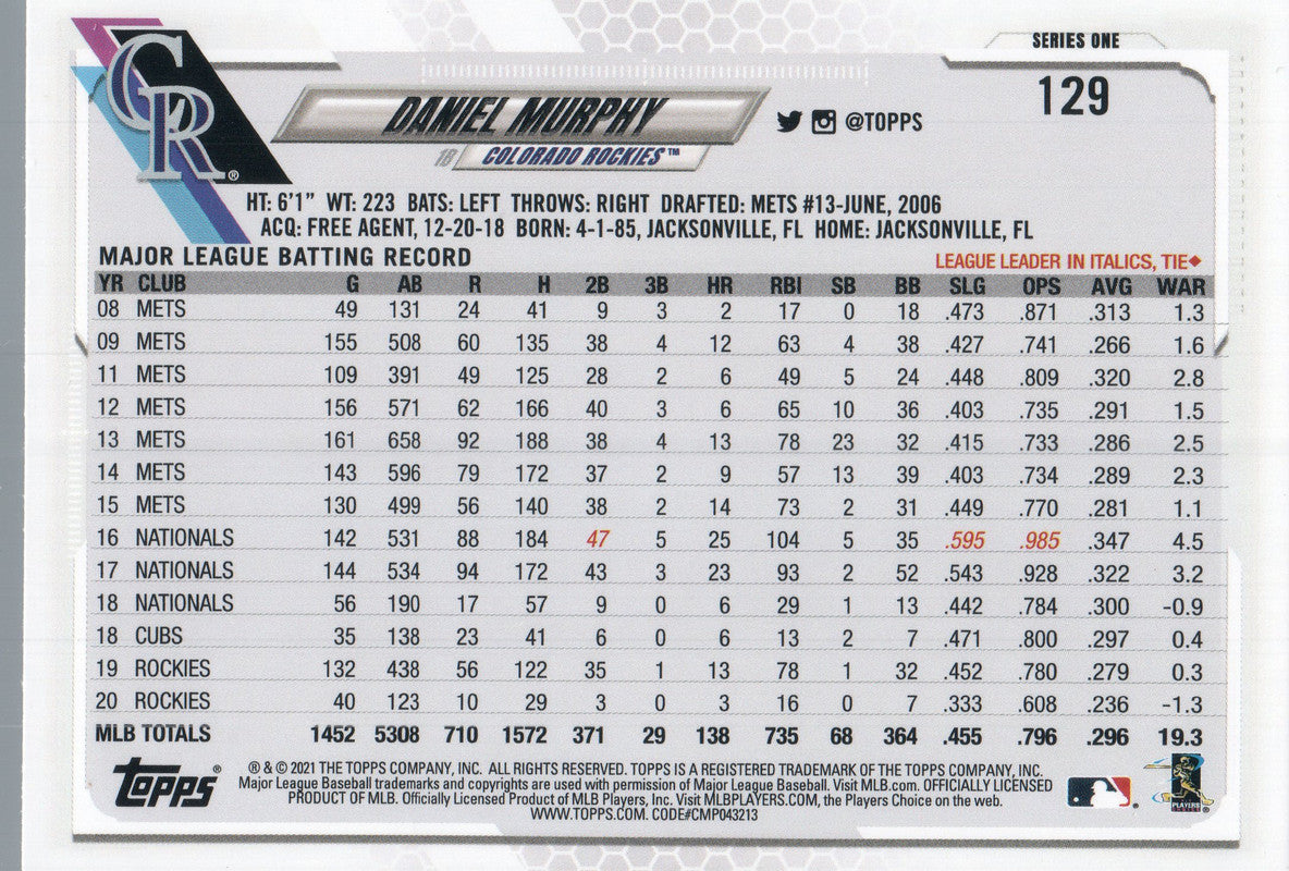 #129 Ddaniel Murphy Colorado Rockies 2021 Topps Series 1 Baseball Card