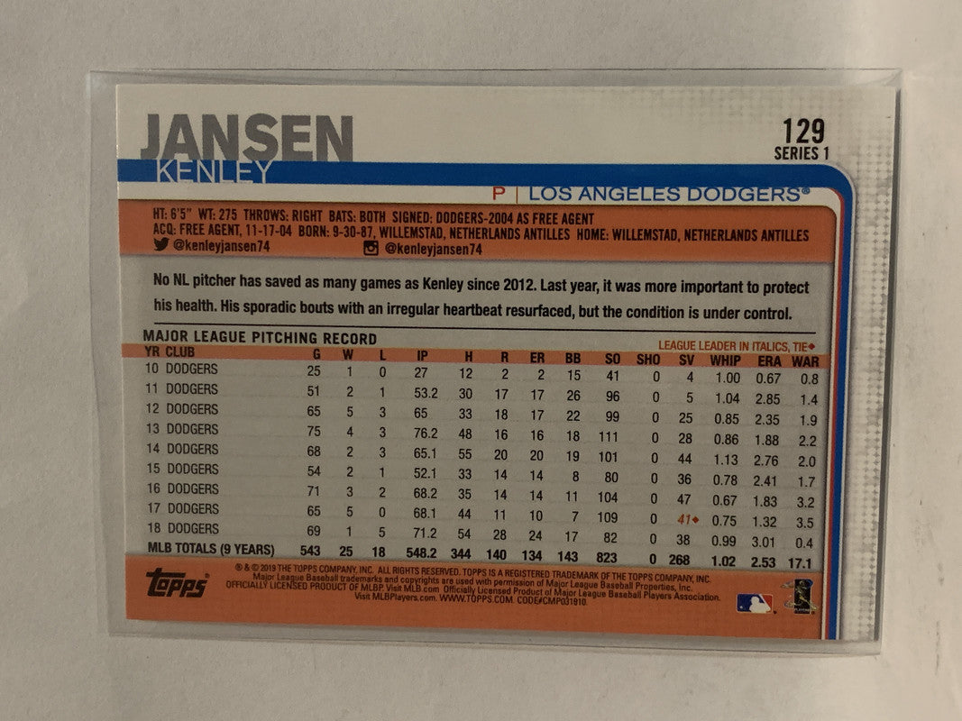 #129 Kenley Jansen Los Angeles Dodgers 2019 Topps Series One Baseball Card