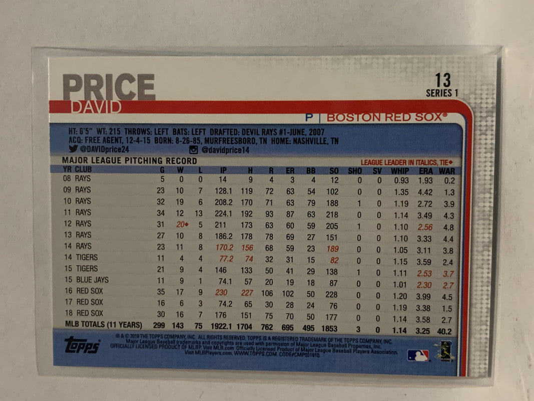 #13 David Price Boston Red Sox 2019 Topps Series One Baseball Card