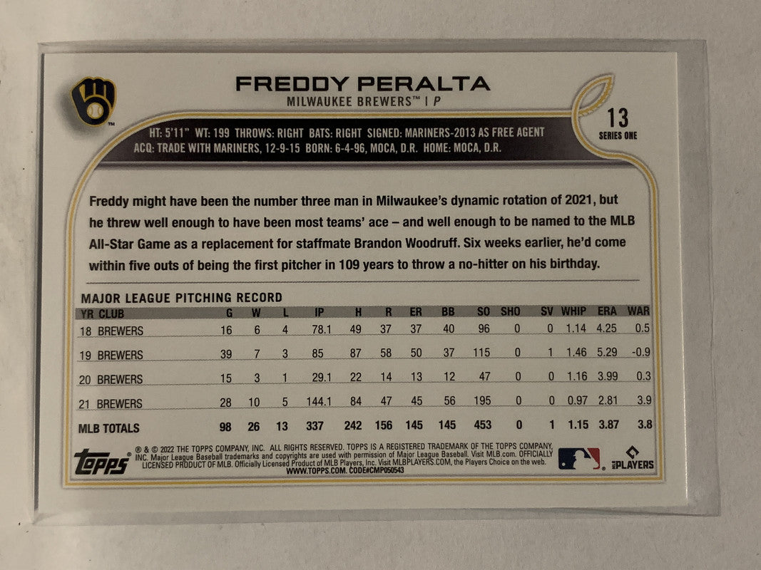 # 13 Freddy Peralta Milwaukee Brewers 2022 Topps Series 1 Baseball Card