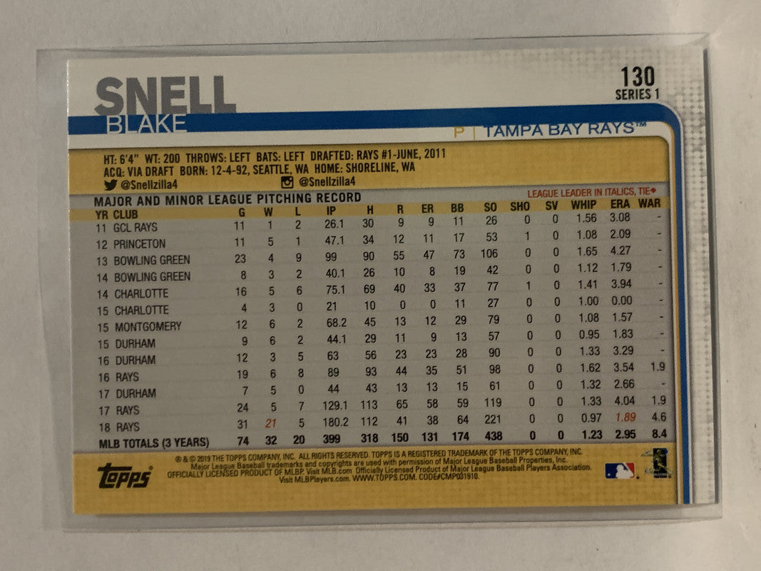 #130 Blake Snell Tampa Bay Rays 2019 Topps Series One Baseball Card