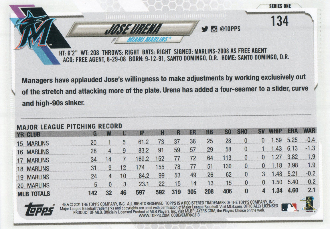 #134 Jose Urena Miami Marlins 2021 Topps Series 1 Baseball Card