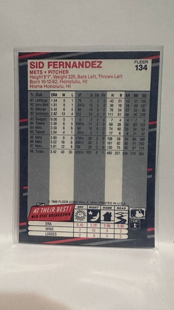 #134 Sid Fernandez New York Mets 1988 Fleer Baseball Card