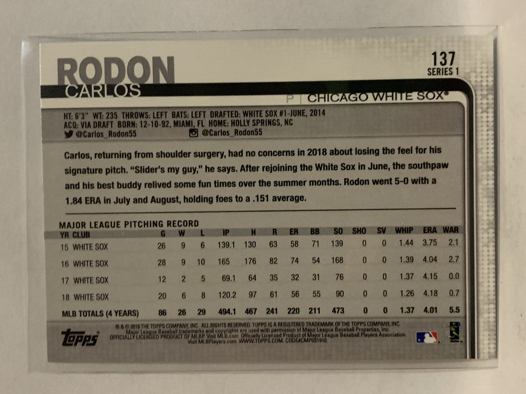 #137 Carlos Rodon Chicago White Sox 2019 Topps Series One Baseball Card