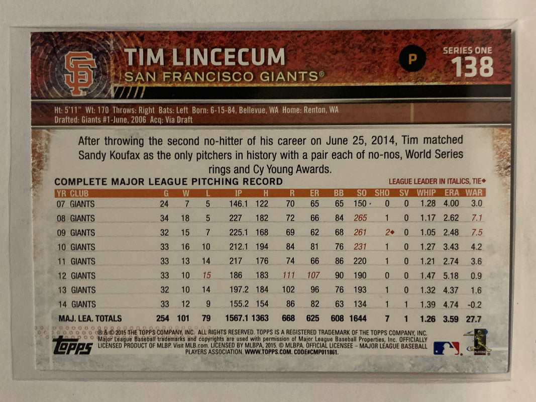 #138 Tim Lincecum San Francisco Giants 2015 Topps Series One Baseball Card