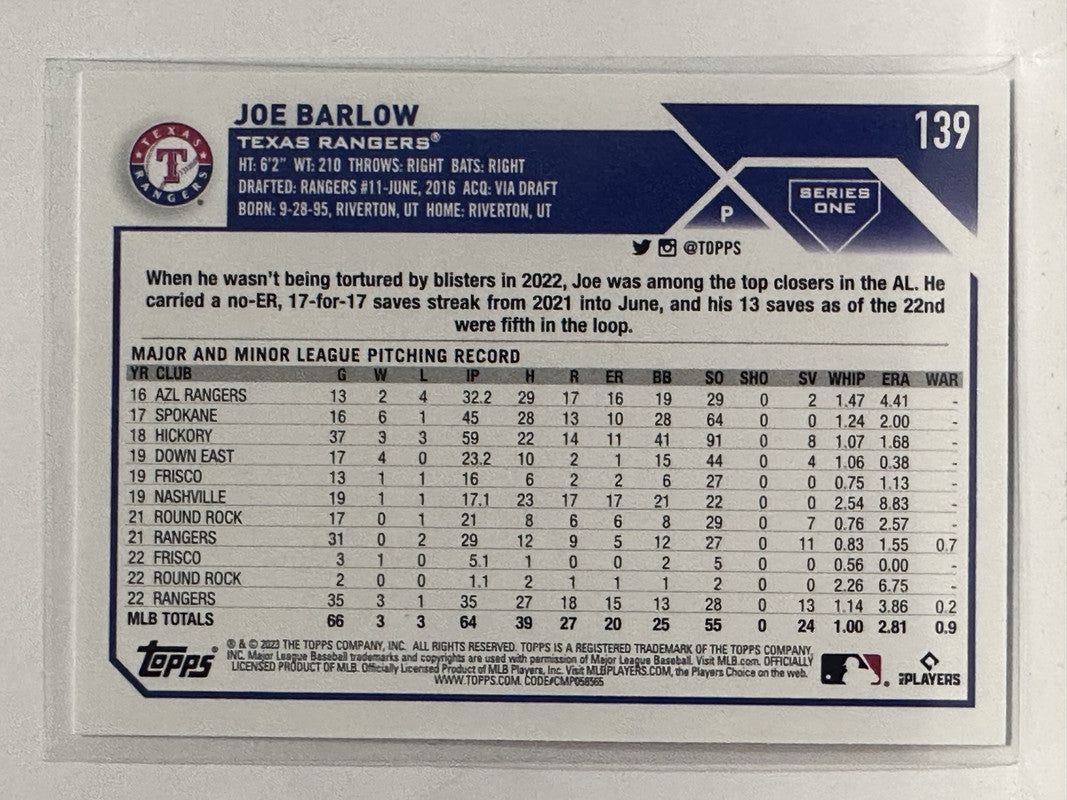 #139 Joe Barlow Texas Rangers 2023 Topps Series One Baseball Card