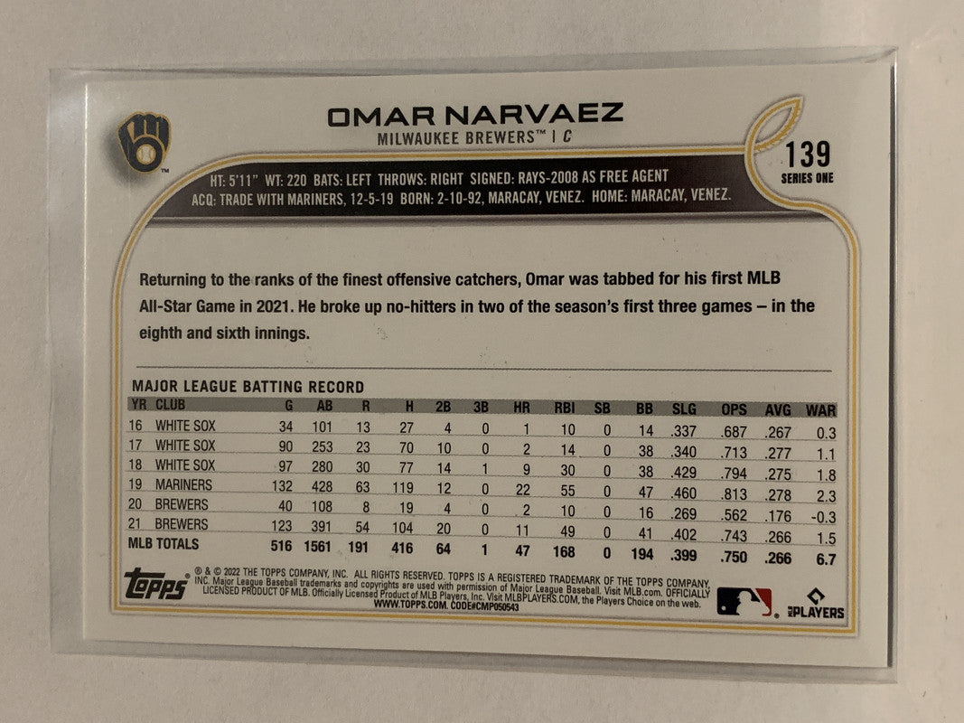 #139 Omar Narvaez Milwaukee Brewers 2022 Topps Series 1 Baseball Card MLB