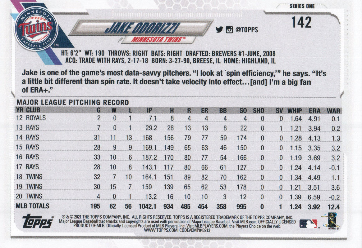 #142 Jake Odorizzi Minnesota Twins 2021 Topps Series 1 Baseball Card