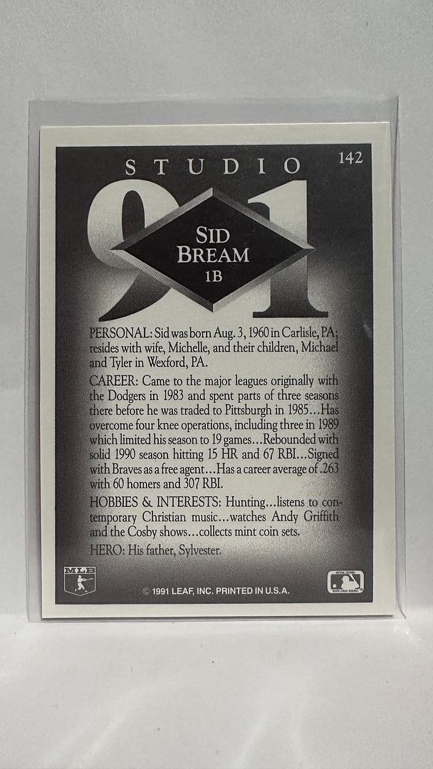 #142 Sid Bream Atlanta Braves 1991 Studio Baseball Card