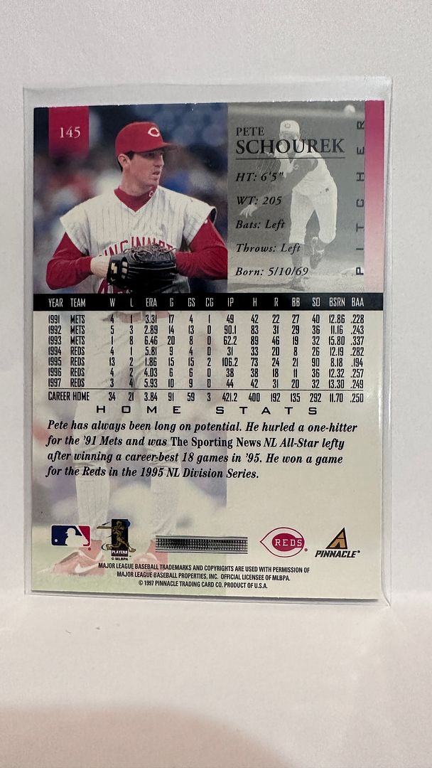#145 Pete Schourek Cincinnati Reds 1997 Pinnacle Baseball Card