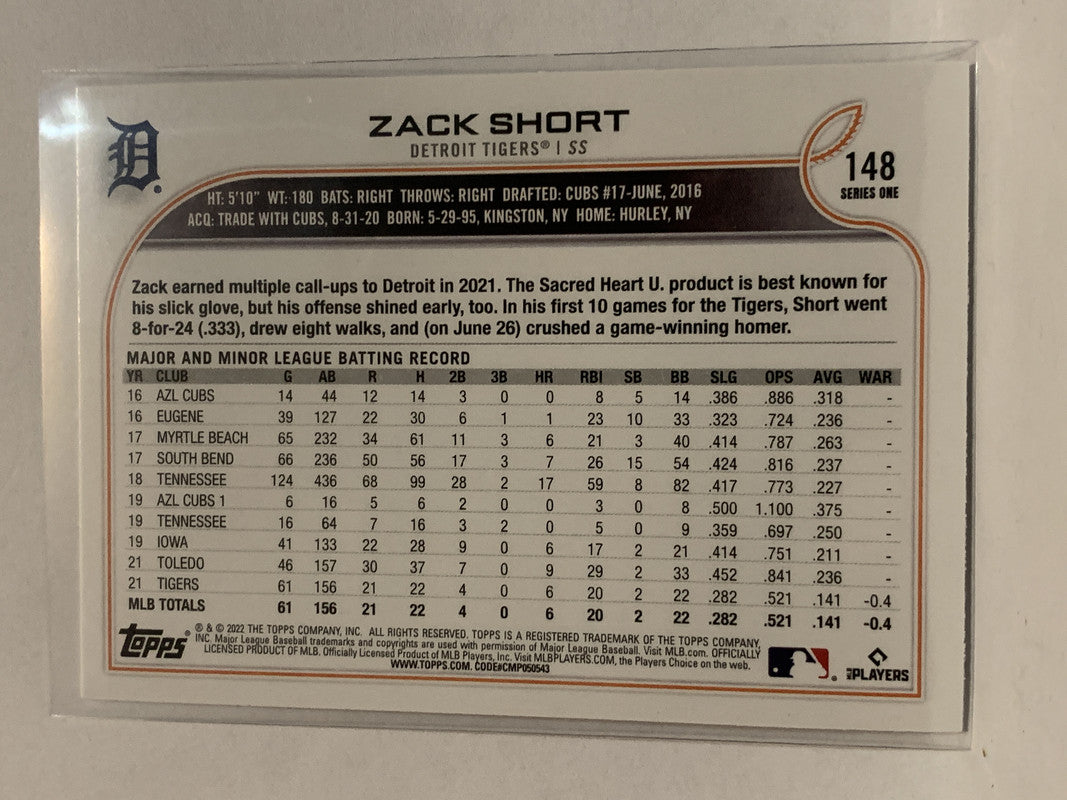 #148 Zack Short Rookie Detroit Tigers 2022 Topps Series 1 Baseball Card MLB