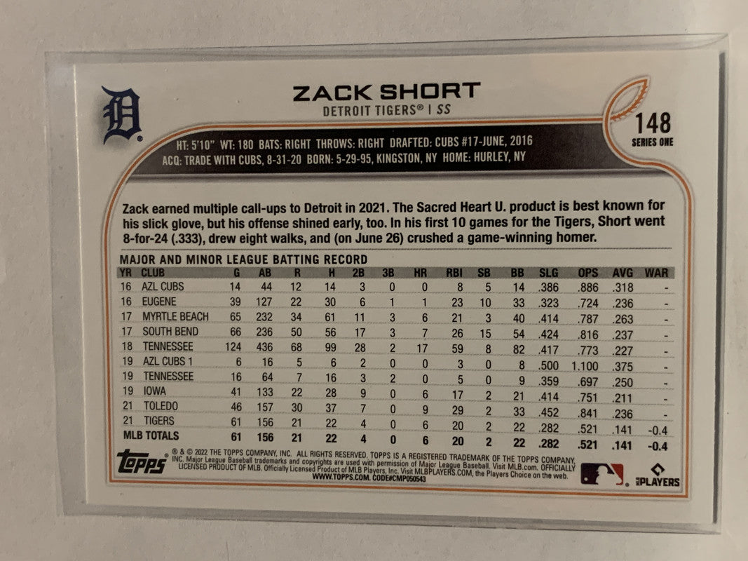 #148 Zack Short Rookie Detroit Tigers 2022 Topps Series One Baseball Card MLB