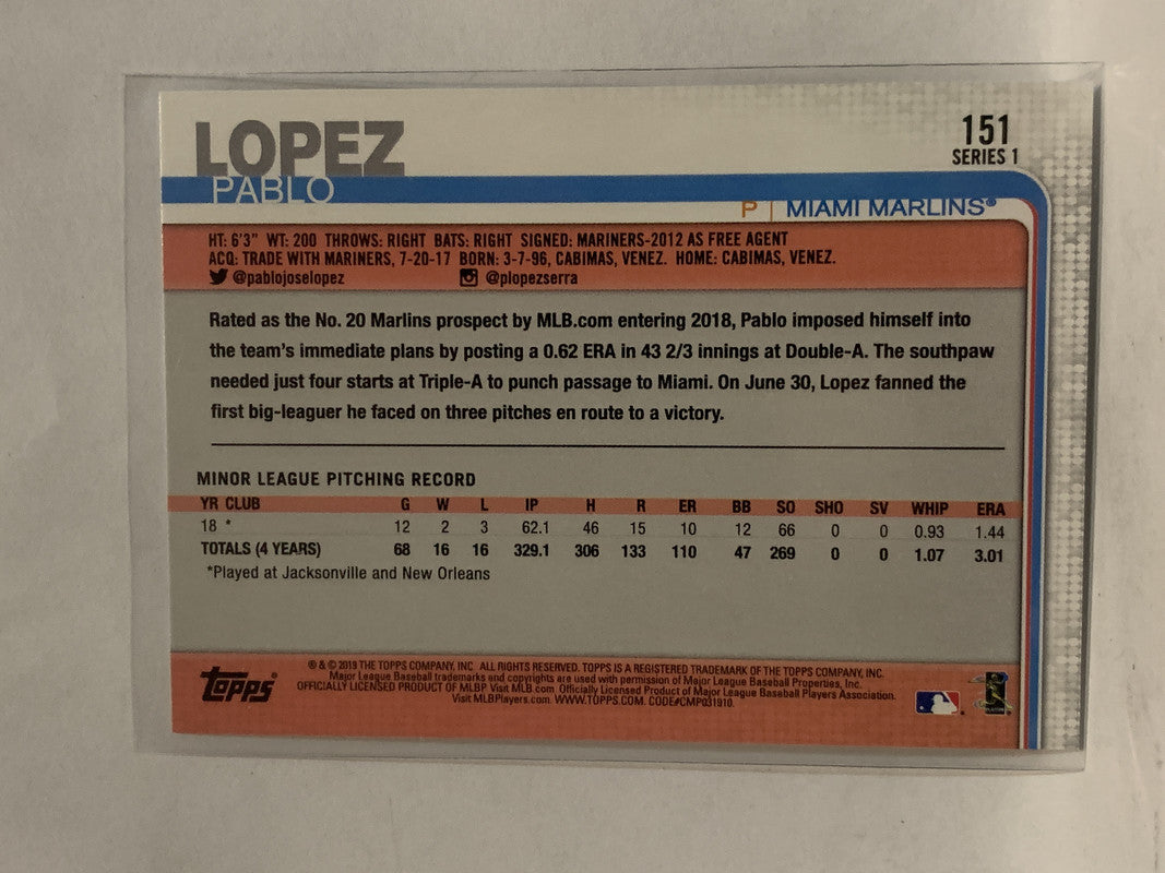#151 Pablo Lopez Rookie Miami Marlins 2019 Topps Series One Baseball Card