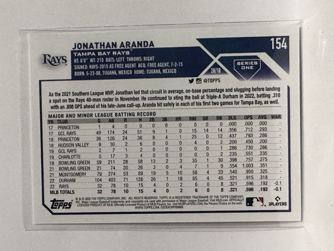 #154 Jonathan Aranda Rookie Tampa Bay Rays 2023 Topps Series One Baseball Card