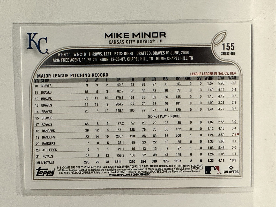 #155 Mike Minor Kansas City Royals 2022 Topps Series One Baseball Card