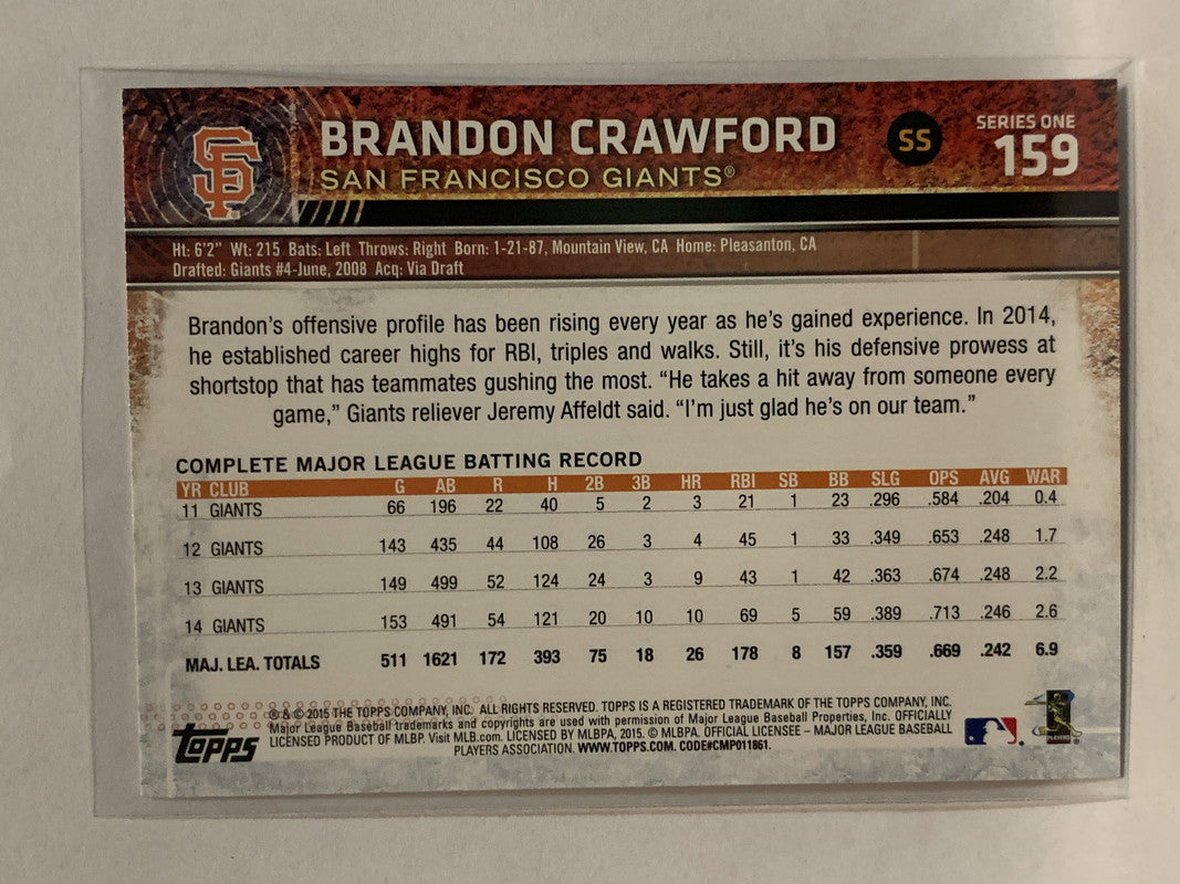 #159 Brandon Crawford San Francisco Giants 2015 Topps Series One Baseball Card